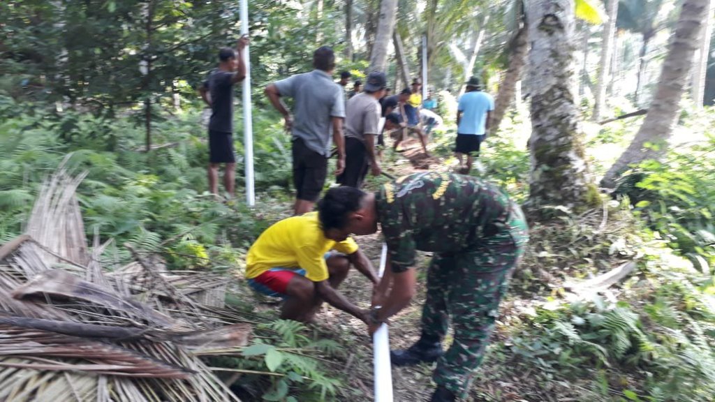 Babinsa Kelurahan Payahe Serda Yunus Do Abas bersama masyarakat Dusun Dua secara swadaya melaksanakan gotong royong melakukan pemasangan pipa saluran air bersumber sumur bor ditampung pada bak penampungan yang berada di ketinggian belakang kampung untuk dialirkan ke rumah warga agar mendapatkan air bersih yang bisa di konsumsi.(Reed)
